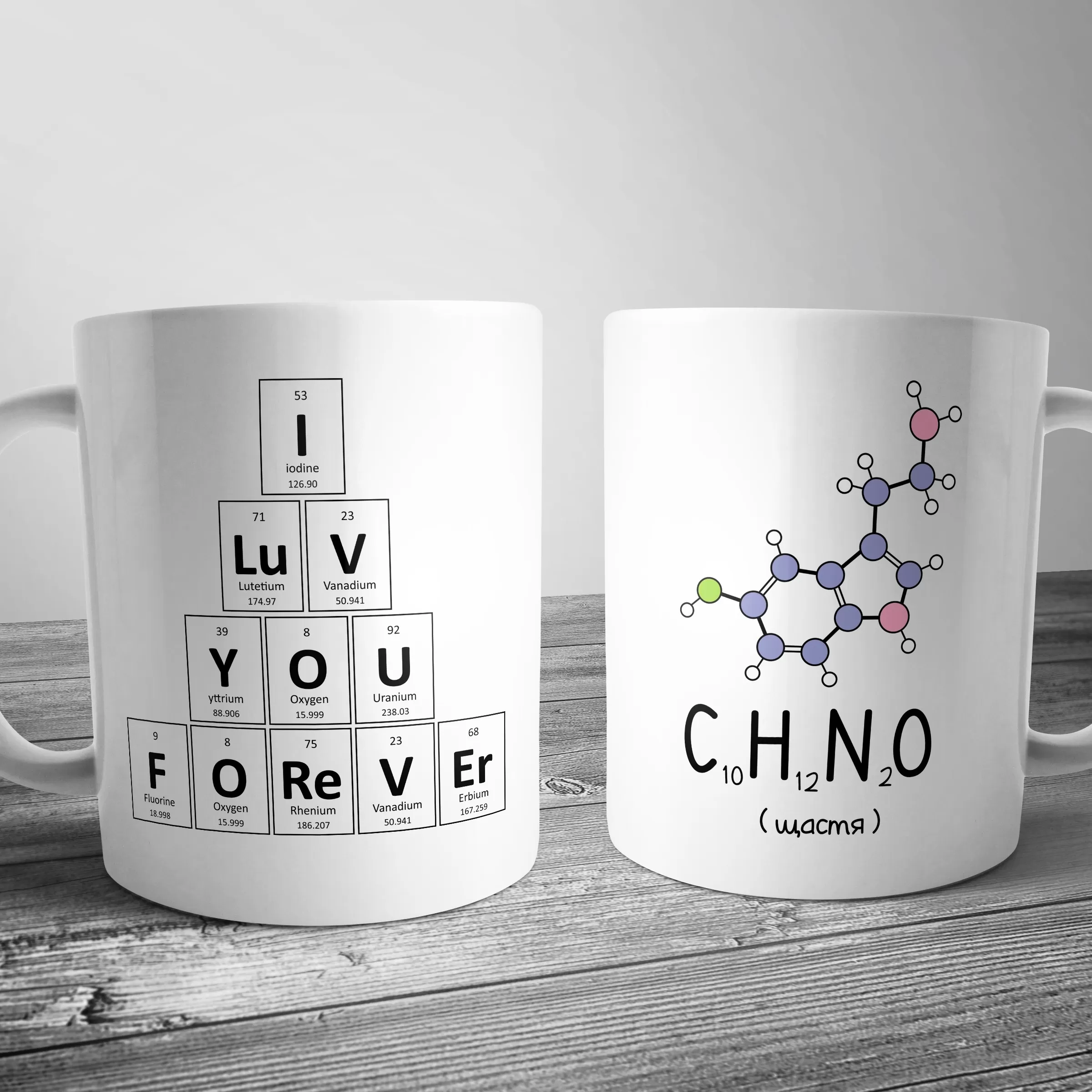 Чака з незвичайним принтом "Я люблю тебе", написаним за допомогою знаків хімічних елементів. Друга сторона з принтом молекули і формулою "серотоніну".