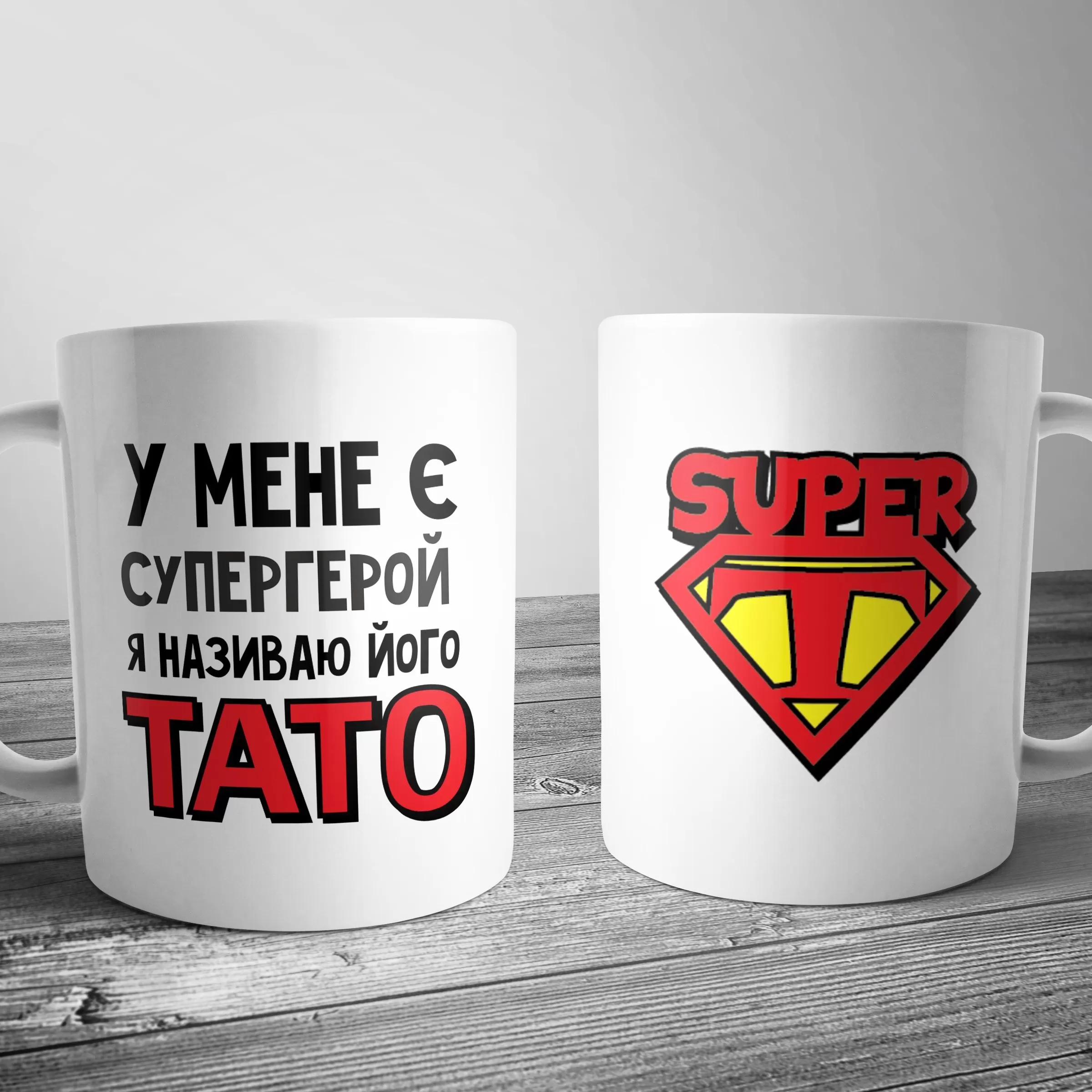 Чашка з написом "У мене є супергерой, я називаю його ТАТО" та "SUPER T".