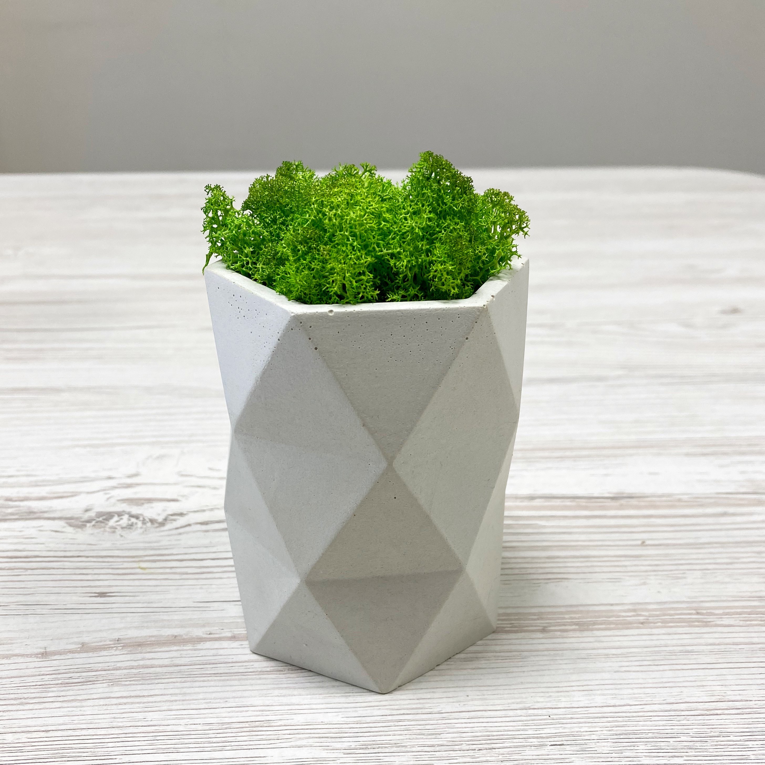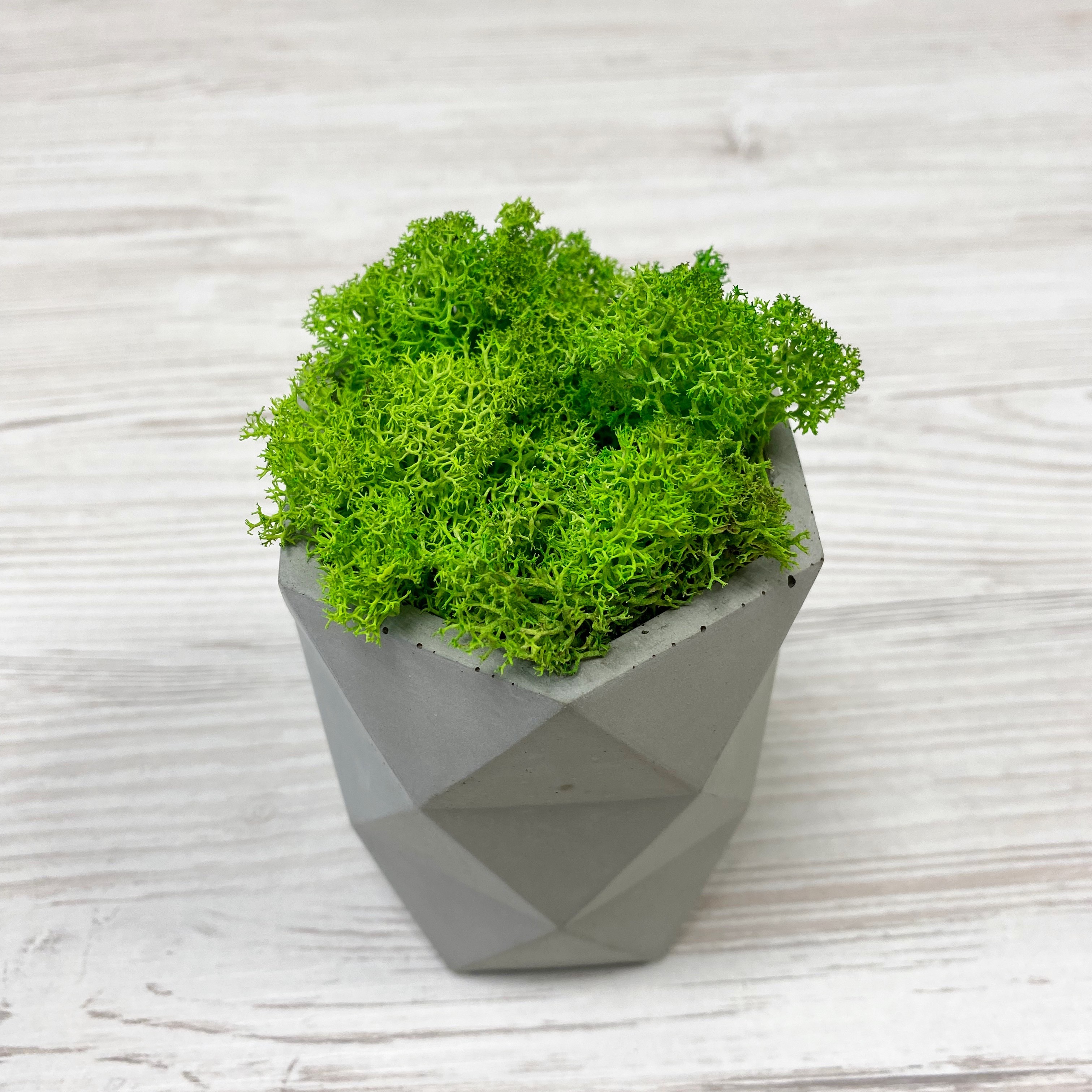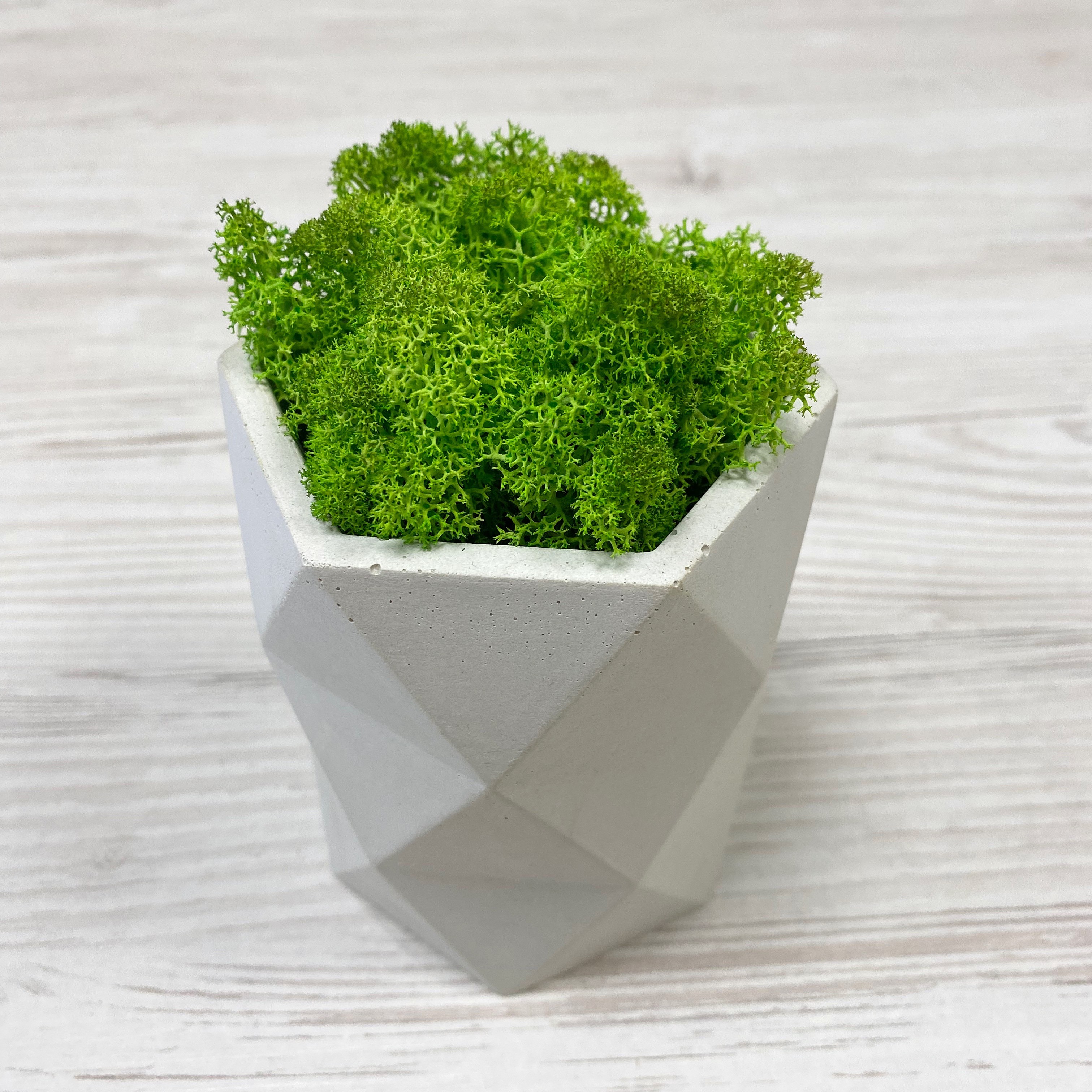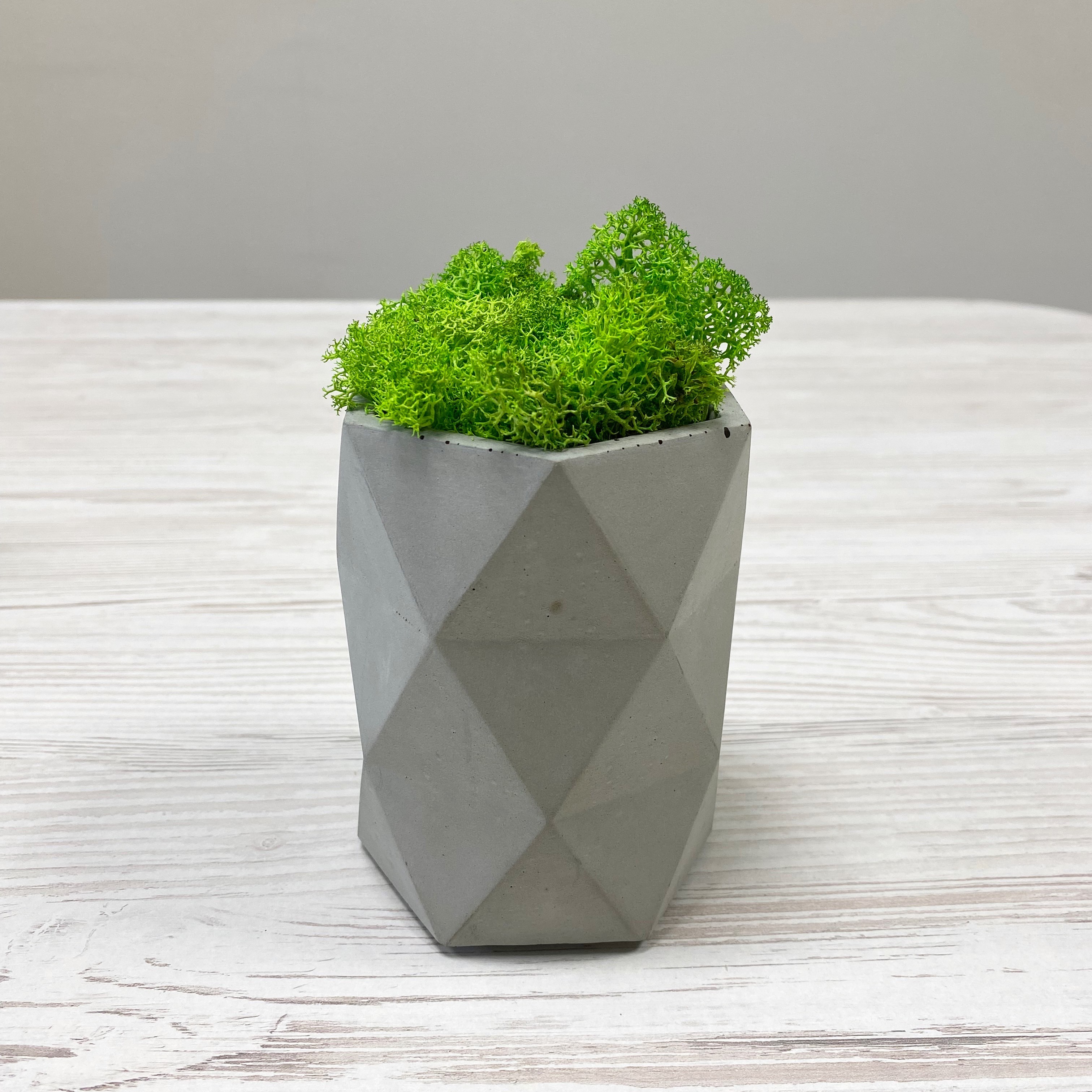 Інтерʼєрне кашпо цікавої геометричної форми з бетону висотою 11 см зі стабілізованим натуральним скандинавським мохом. Діаметр кашпо - 8 см.