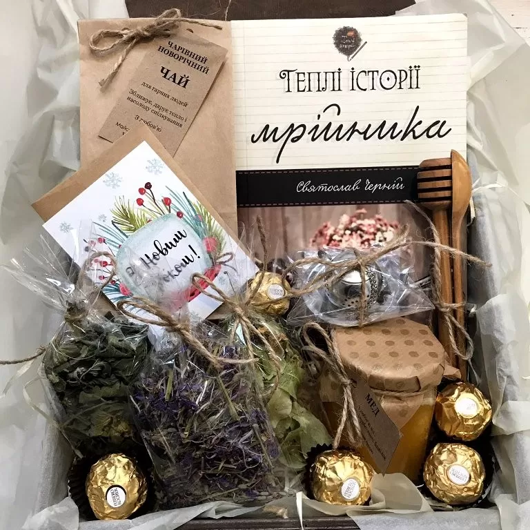 Подарунок татові - любителю чаю з медом. А взагалі - подарунок універсальний і за складом завжди підійде для дорогої людини. Подарунковий набір складається з: чай, мед натуральний, бочечка для меду з ложкою для меду, індивідуальний заварник для чаю в формі чайника, збори трав, книга з теплими історіями і цукерки Ferrero Rocher. Дерев'яна подарункова коробка.