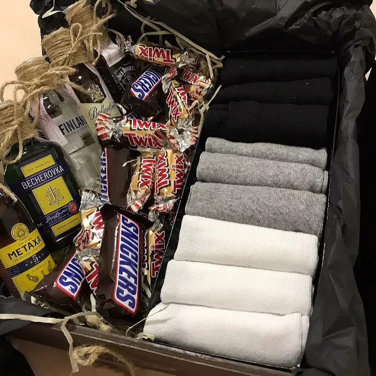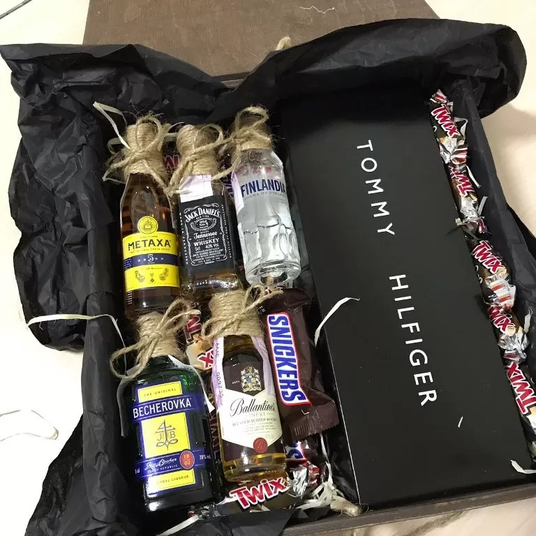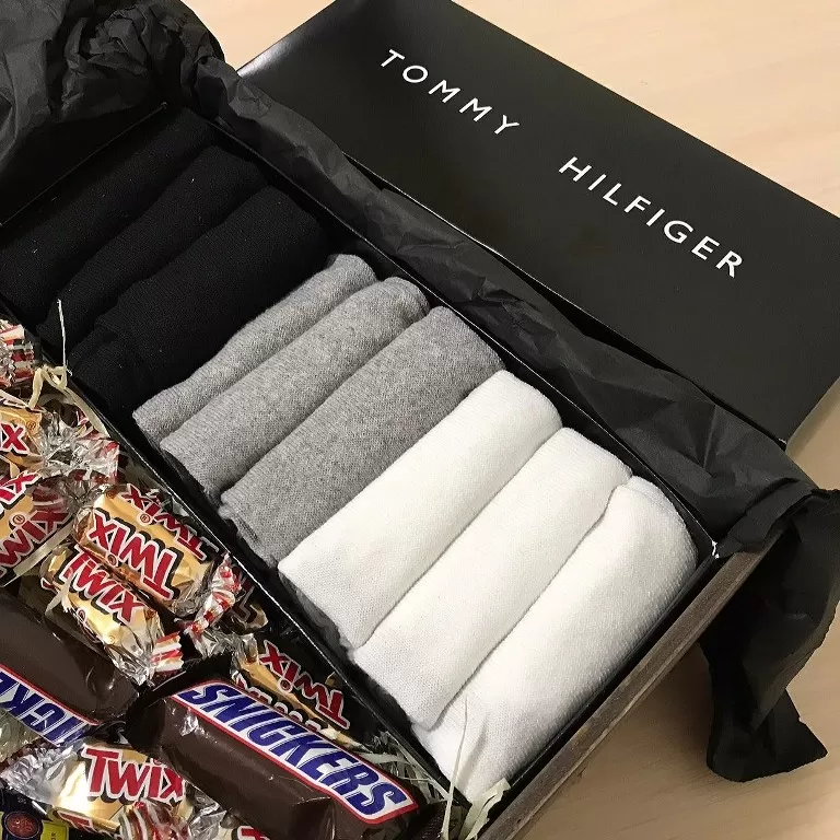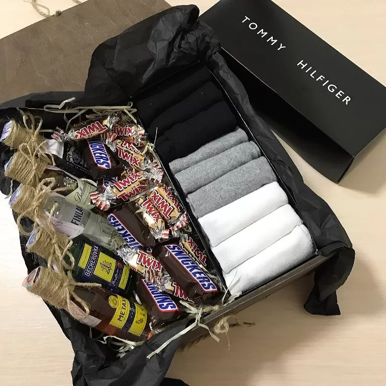Даруйте носочки красиво :) Подарунковий набір чоловічих шкарпеток 9 пар Tommy Hilfiger, кольори: сірий, чорний і білий - по 3 пари кожного кольору. Подарункова дерев'яна коробка із солодощами та міні-пляшечками алкоголю на вибір по 50 мл.