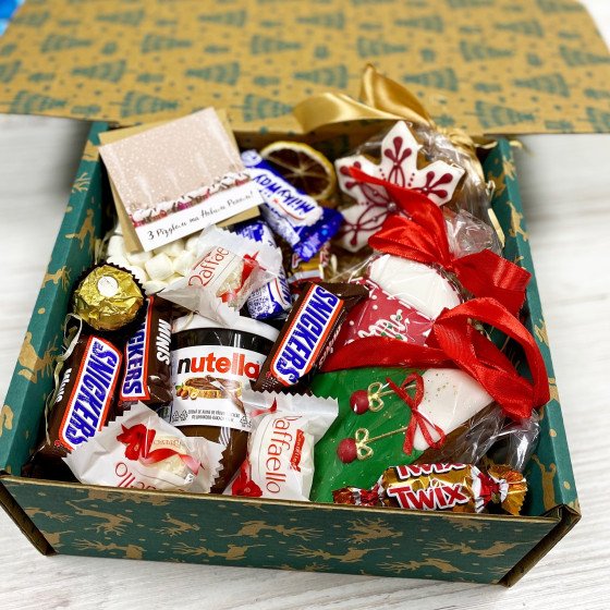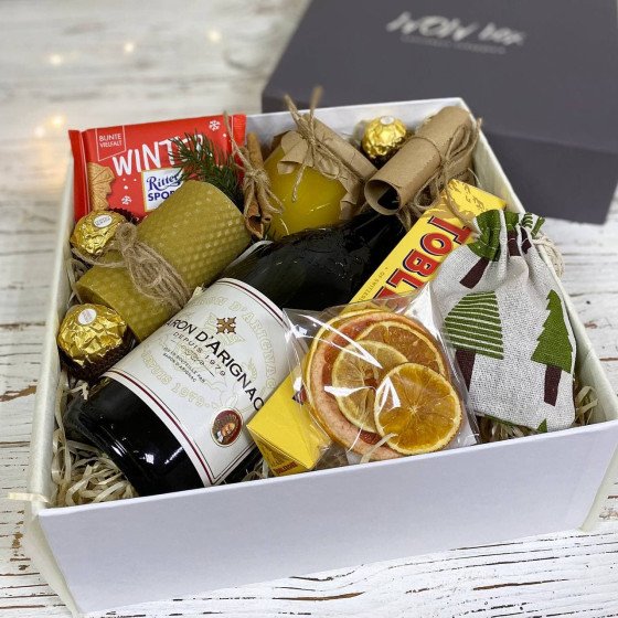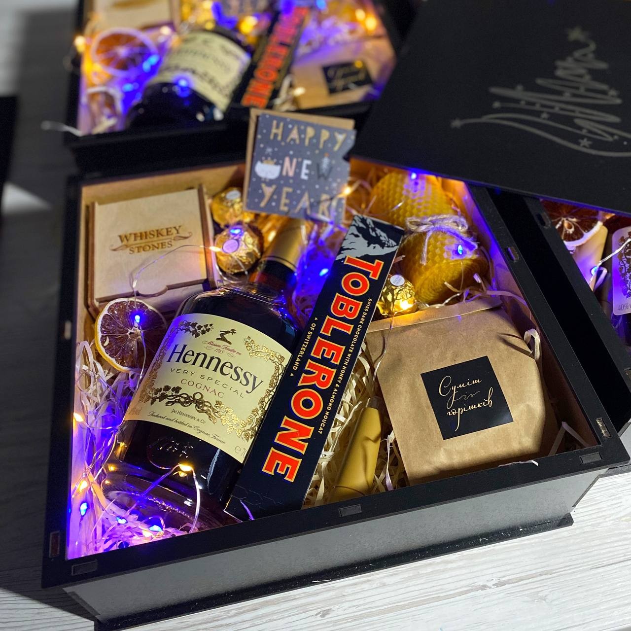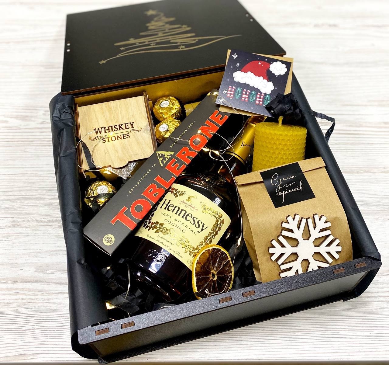 Подарунковий набір з Hennessy 0,5л та камінцями для охолодження напоїв "Whiskey stones". Також в набір входять: свічка з натуральної вощини, шоколад Toblerone, суміш горішків, цукерки Ferrero Rocher та новорічна LED гірлянда.