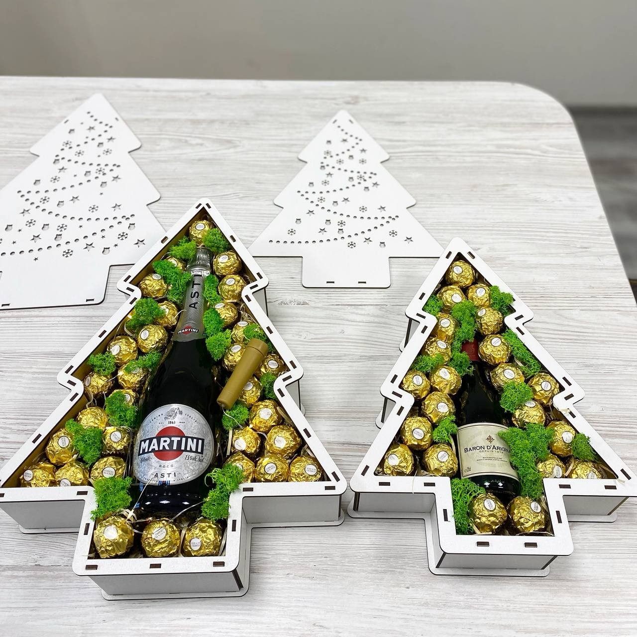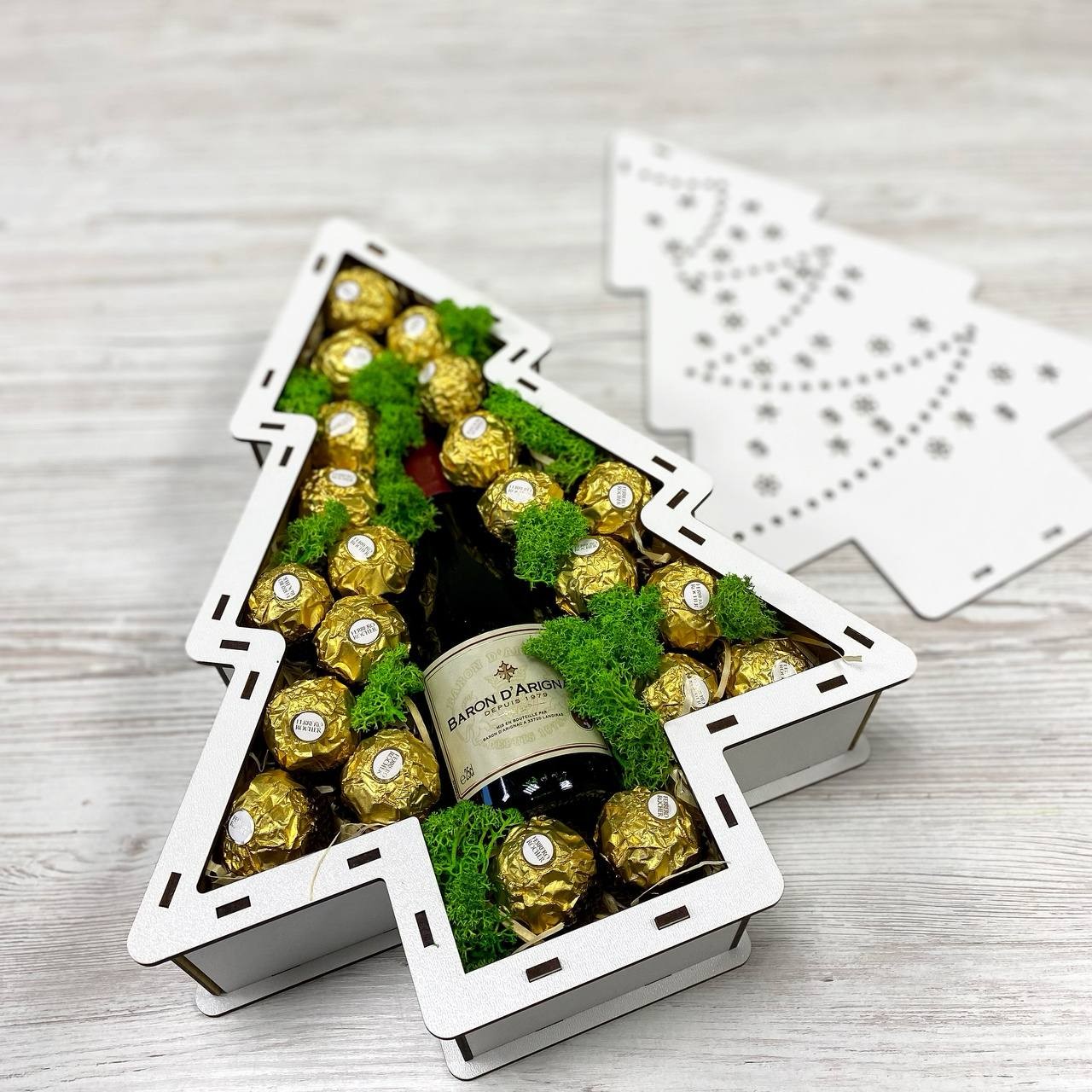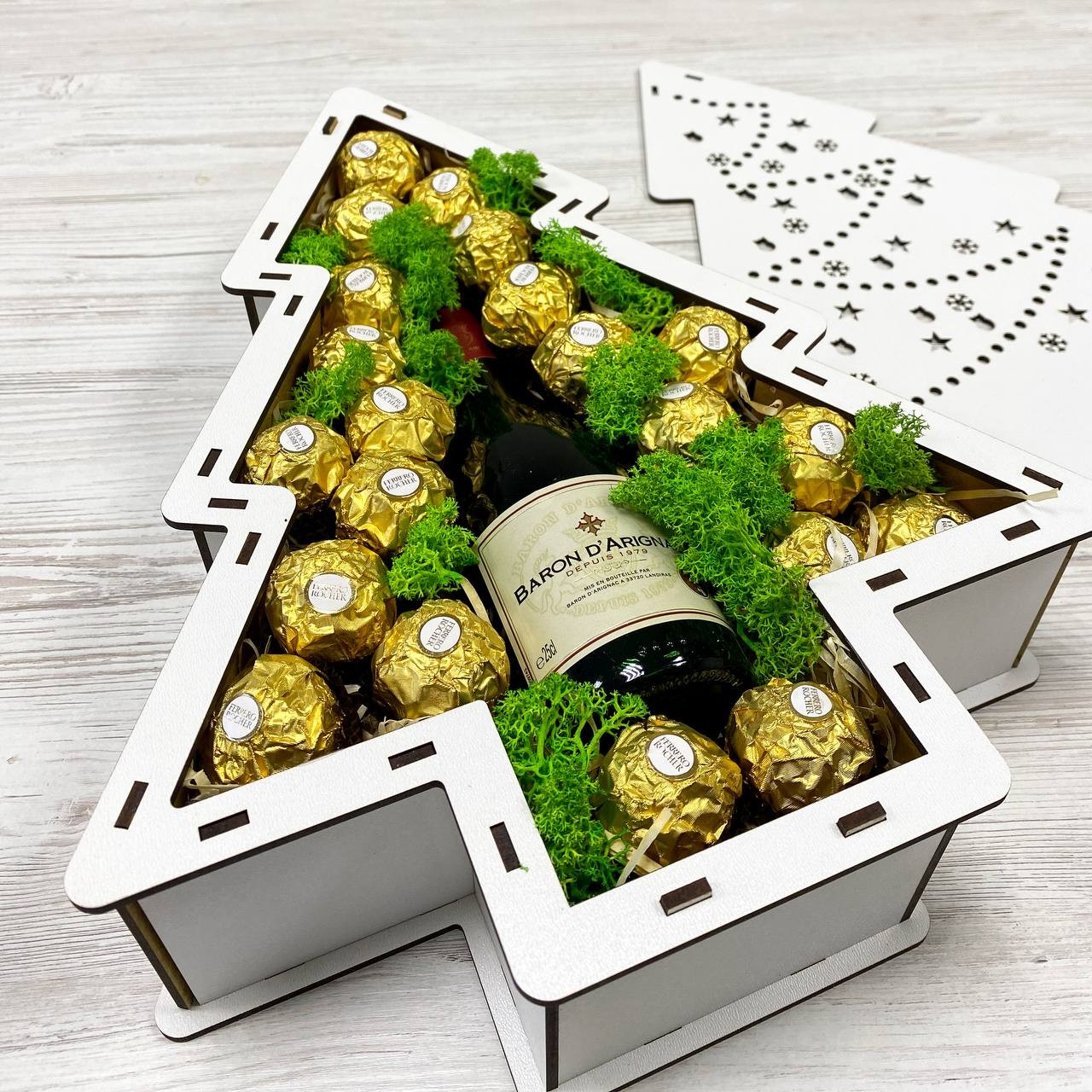 Подарунок на Новий Рік та Різдво в коробочці у формі ялинки з маленькою пляшечкою вина 250мл та цукерками.