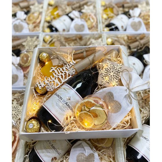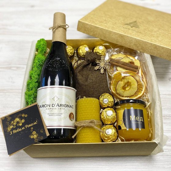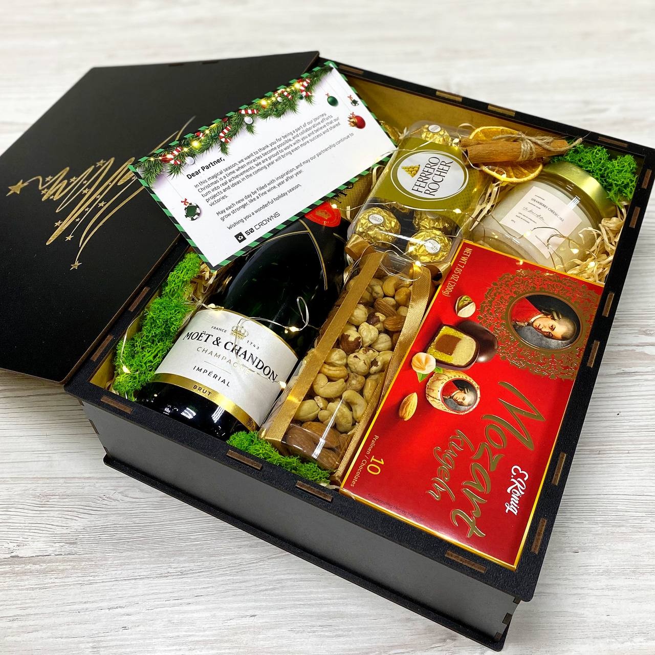 Подарунковий бокс з шампанським Moet & Chandon Imperial брют, австрійськими марципанами Mozart та цукерками Ferrero Rocher. В складі також свічка в склі ароматизована, суміш горішків в тубусі та декоративна LED стрічка. Листівка на вибір.