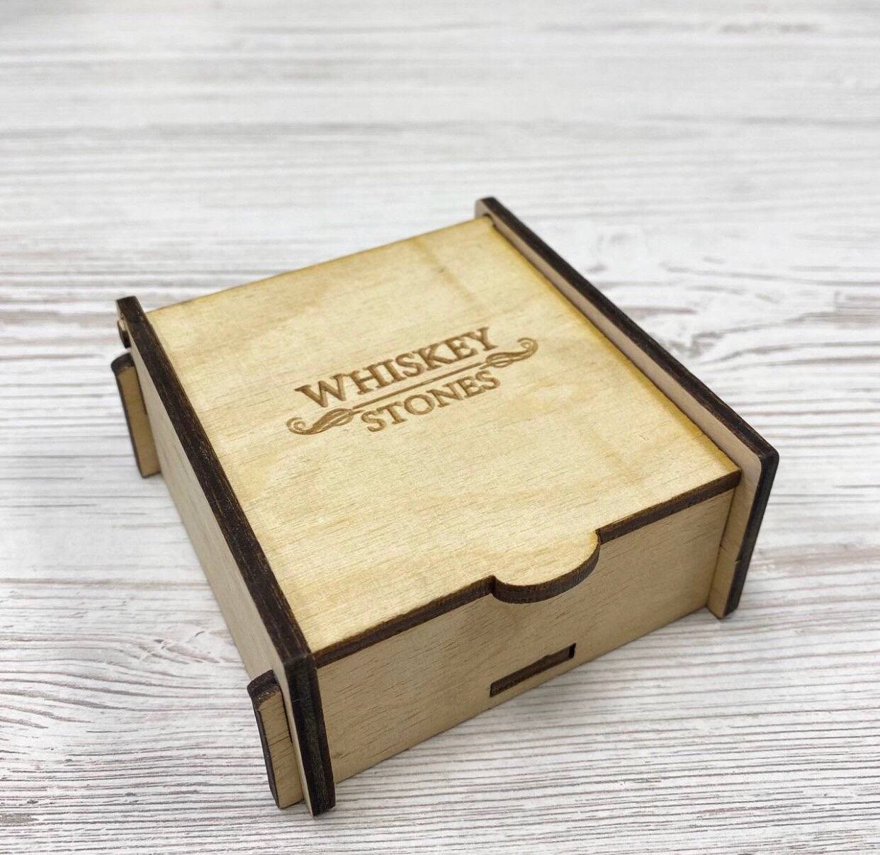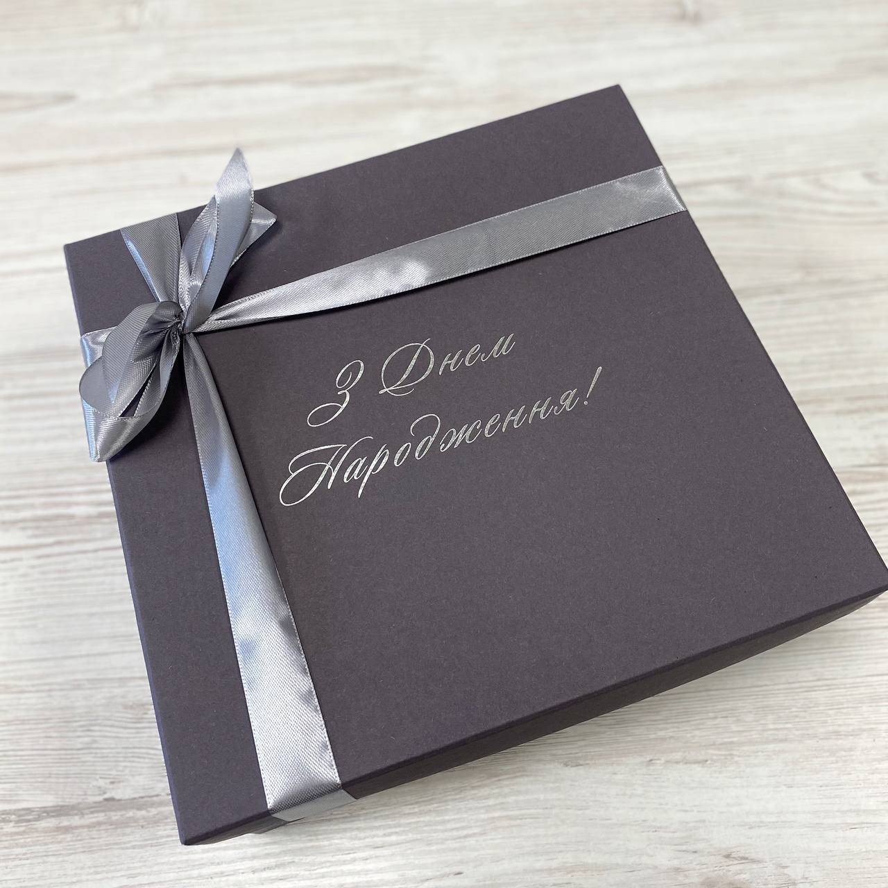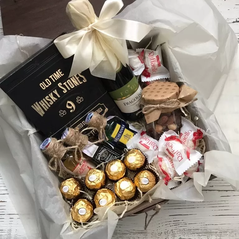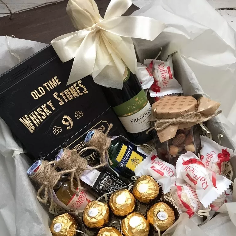 З одного боку в коробці 25х26 см. розміщені камені для віскі, три пляшечки елітного алкоголю по 50 мл, цукерки Ferrero Rocher. З іншого боку - вино ігристе, горішки та цукерки Raffaello.