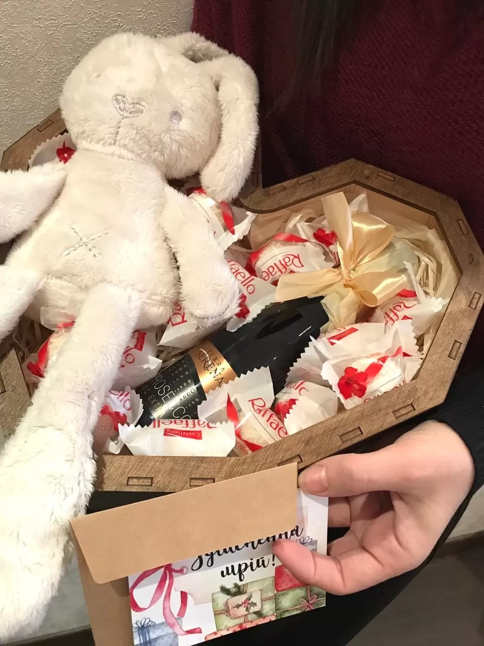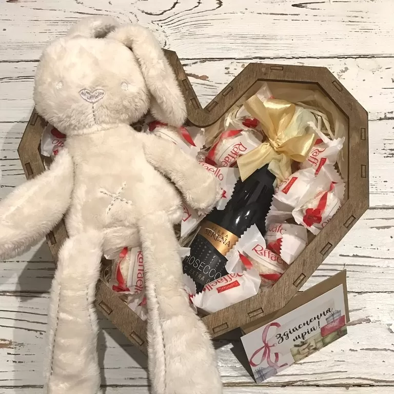 Подарунковий набір в коробці у вигляді серця з плюшевим зайчиком, мініатюрою ігристого вина "Просеко" 250 мл і цукерками Раффаелло. Листівка на вибір.