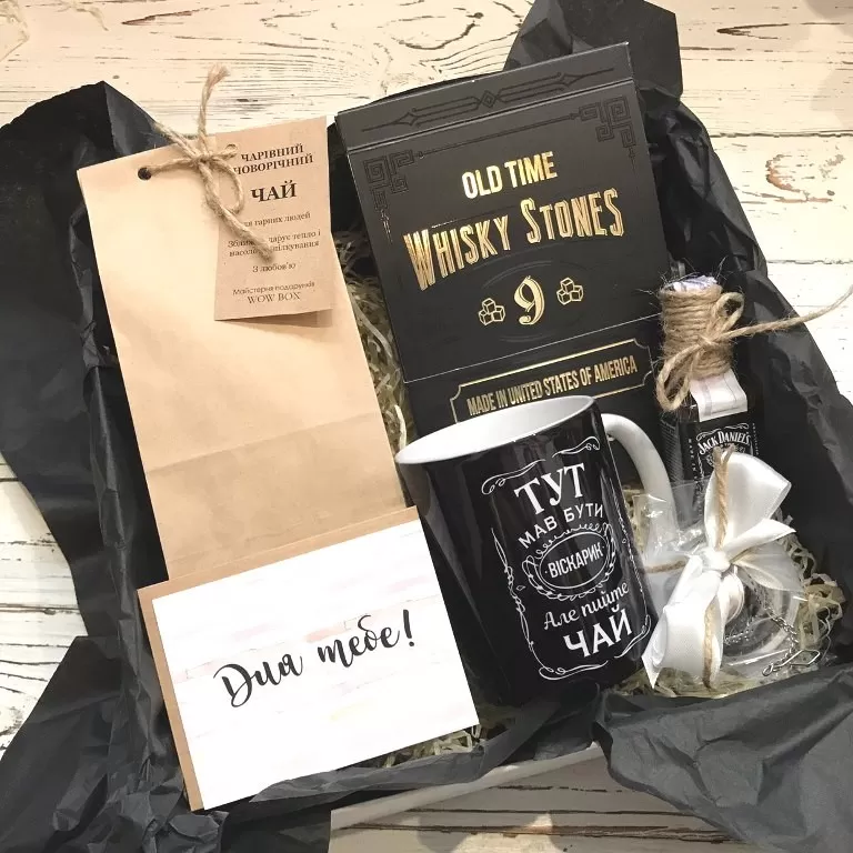 У складі: чай, чашка з принтом під віскі Джек Деніалс, заварник для чаю індивідуальний на одну чашечку, маленька пляшечка віскі 50 мл, камені для віскі 9 шт з мішечком для зберігання, листівка.