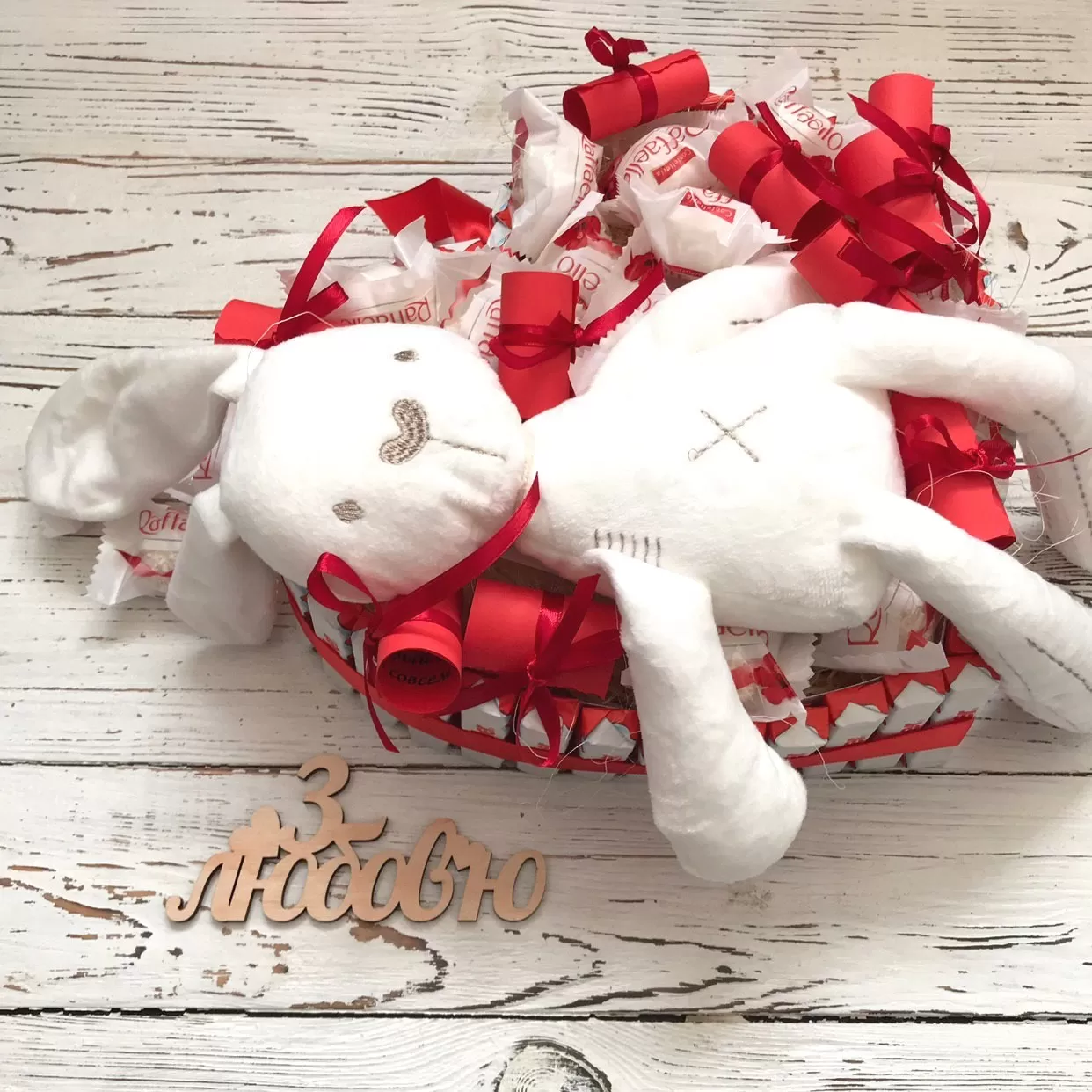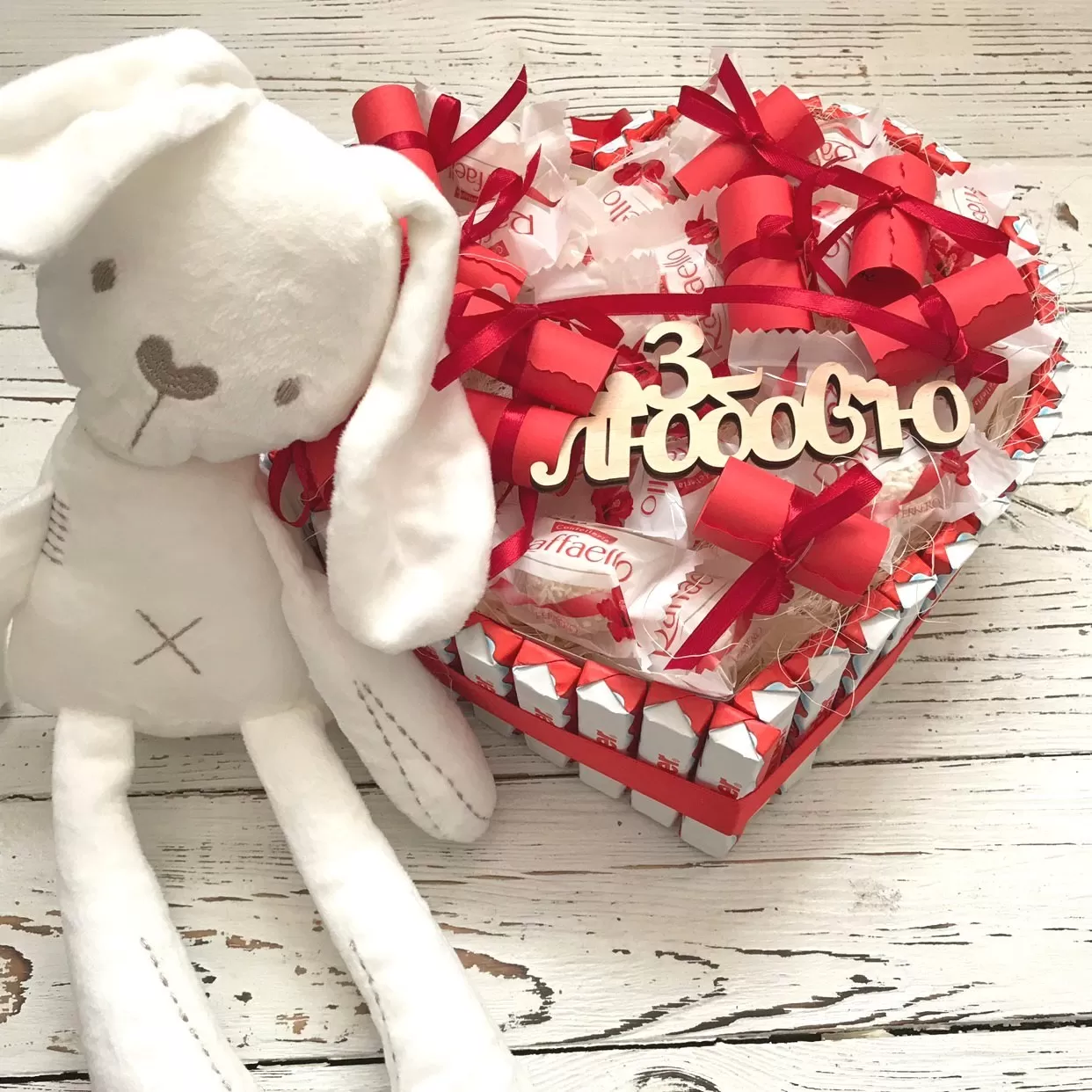 М'яка іграшка - плюшевий зайчик в наборі з смачними улюбленими цукерками Raffaello і записочками. Подарунковий набір для дівчини, оформлений в подарунковій коробці з шоколаду кіндер у формі серця.