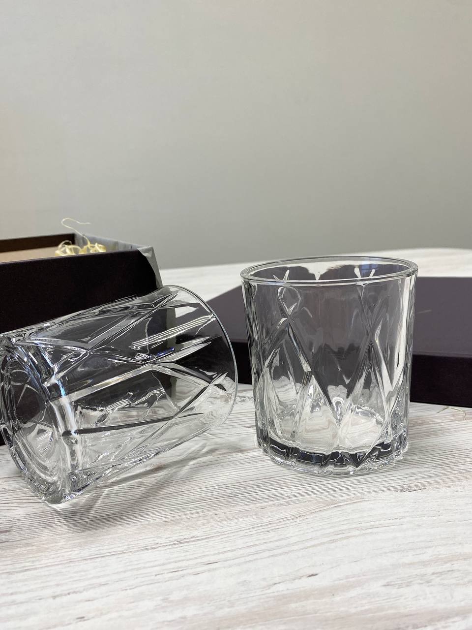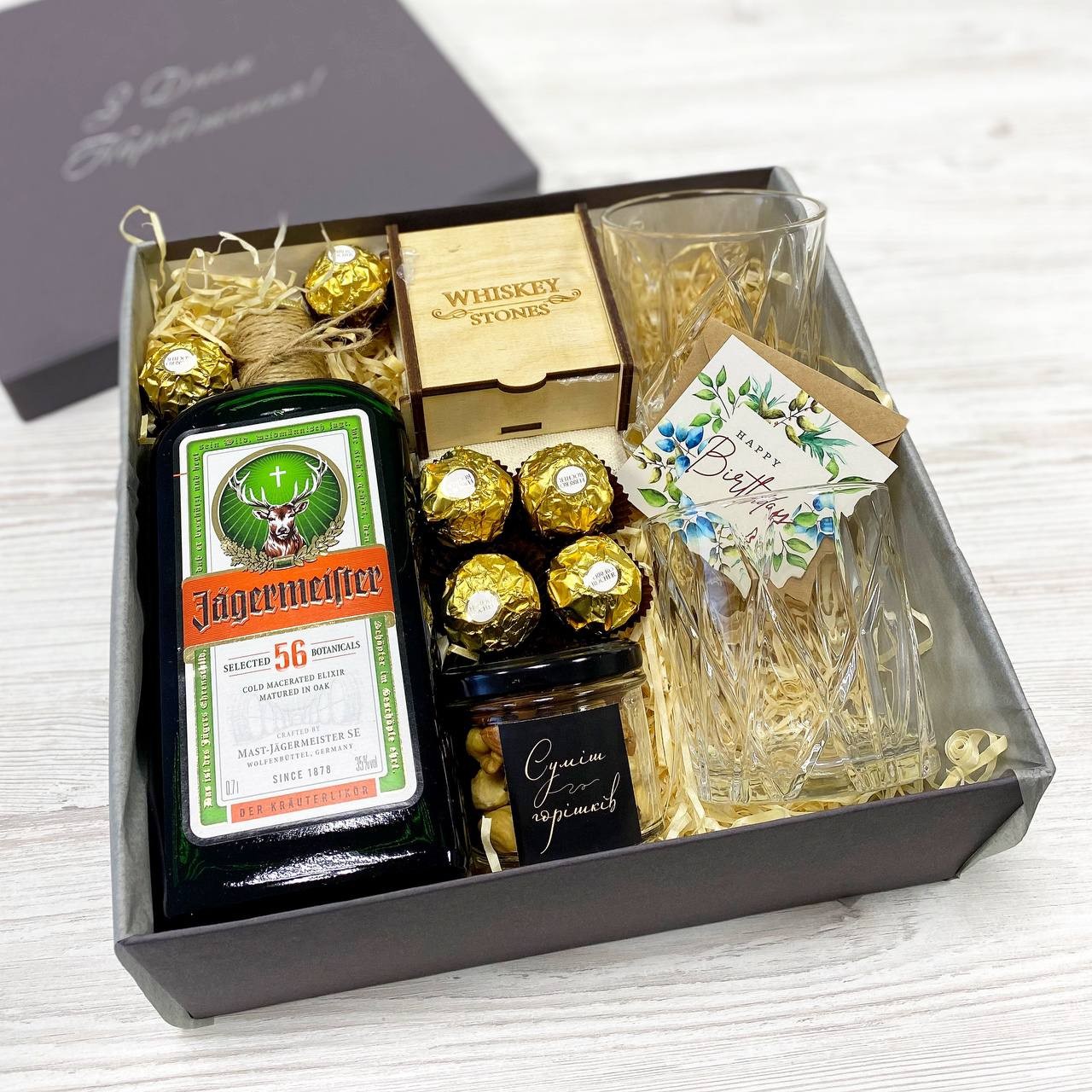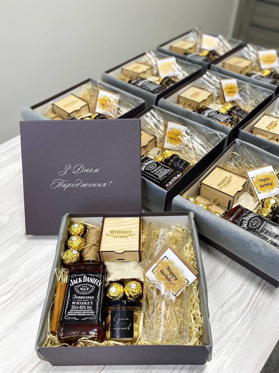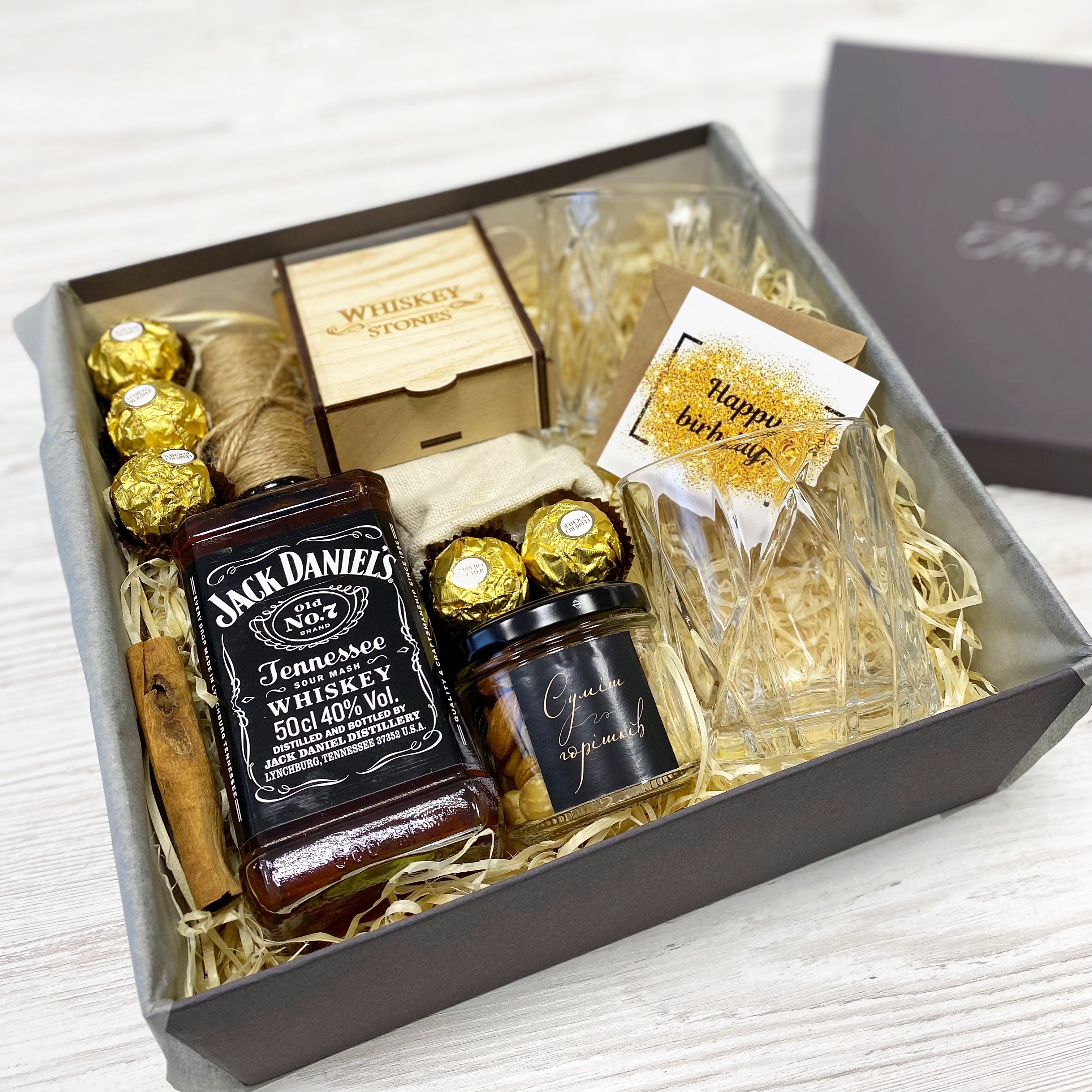 Подарунковий набір з Jack Daniel's 0,5 л, бокалами для віскі та камінцями для охолодження віскі, що оформлення в деревʼяній коробочці з мішечком для зберігання та щипчиками.