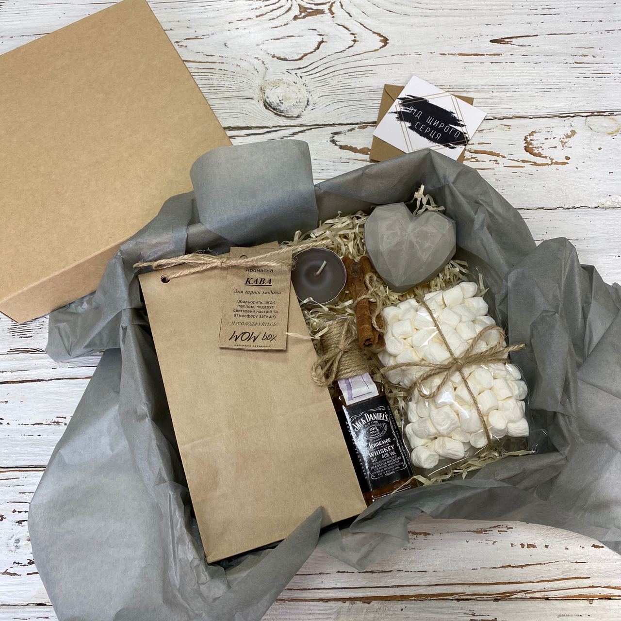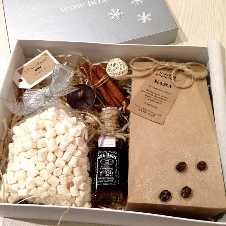 У подарунковий набір входить ароматна кава натуральна (мелений або в зернах на вибір), міні-пляшечка віскі, зефіркі маршмеллоу, палички кориці і свічка з ароматом шоколаду.