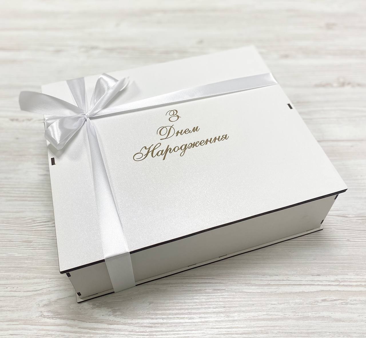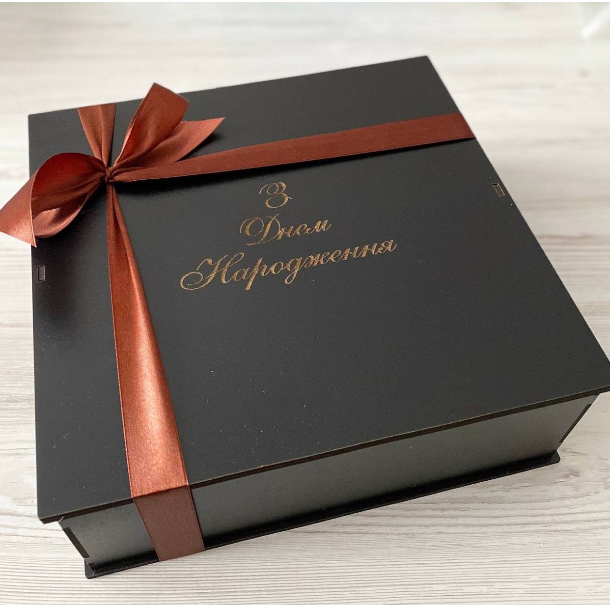 Велика подарункова коробка у формі книги з написом «З Днем Народження» та наступним наповненням: