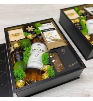 Коробки выполнены на заказ с гравировкой логотипа. Набор может быть сформирован с любым напитком на ваш выбор.