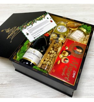 Подарунковий бокс з шампанським Moet & Chandon Imperial брют, австрійськими марципанами Mozart та цукерками Ferrero Rocher. В складі також свічка в склі ароматизована, суміш горішків в тубусі та декоративна LED стрічка. Листівка на вибір.