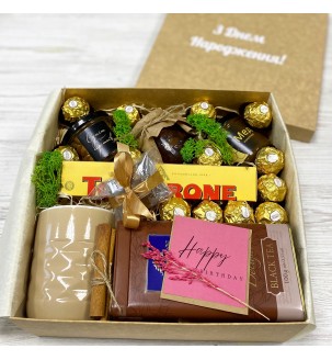 Англійський листовий чай з чашечкою (є варіанти на вибір) та цукерками, швейцарським шоколадом, а також трьома баночками смаколиків: конфітюр, натуральний мед та суміш горішків.