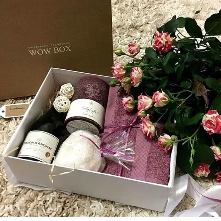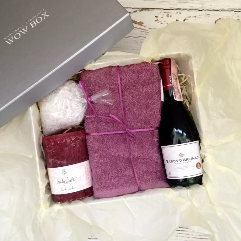 В даному варіанті подарунку: вино, декоративна свічка, рушник та сіль для ванни.